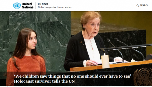 Speaking in the General Assembly Hall alongside one of her great grandchildren, Mrs Lazan described her family’s journey from a ‘comfortable’ life in Hoya, northwest Germany, to a detention camp in the Netherlands – and in January 1944, internment in Bergen Belsen concentration camp.