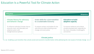 We believe that education—often overlooked as a factor in reaching these goals—must become a more central theme in climate discussions and that the education sector needs to ratchet up its own ambitions to spur climate justice. (See the exhibit.) There is no time to waste.